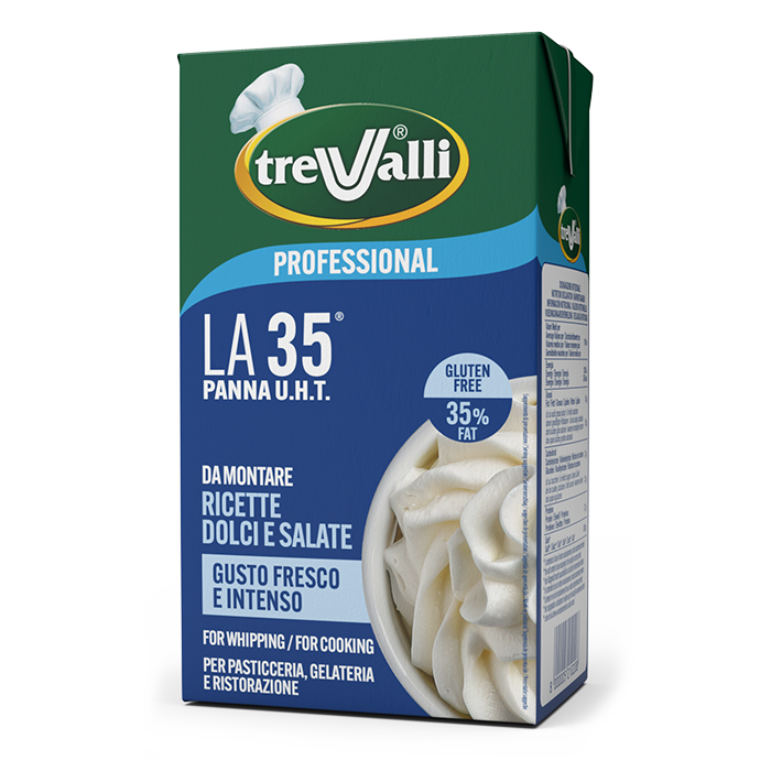 - Montare la panna Trevalli Professional U.H.T. da montare e per cucina LA 35, ultimare il dressaggio della panna montata e decorare a piacere.